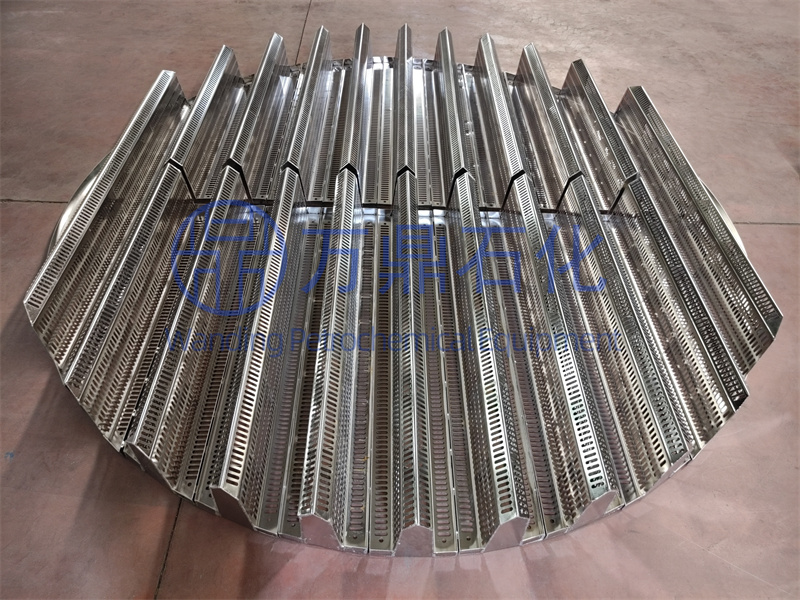 是由金屬板加工的網(wǎng)板沖壓成波形,然后焊在鋼圈上。網(wǎng)孔呈菱形,為便于導(dǎo)液,波形按長軸沖制。我國目前生產(chǎn)的鋼板網(wǎng)**厚度,碳鋼為8mm,不銹鋼為6mm,菱形尺寸長軸為150mm,短軸為60mm。菱形尺寸視所用填料而定,對于小填料,例如4mmX4mm金屬網(wǎng)環(huán)填料,可在大尺寸菱形支承網(wǎng)上再鋪一層長軸為3mm的薄鋼板網(wǎng)。波紋高度25mm至50mm,波距要大于50mm,這種形式的支承裝置適用于直徑1.2m以下的小塔,可制成整體式,從塔體法蘭裝入;也可制成兩塊或多塊,由人孔進(jìn)入,在塔內(nèi)組裝。對于直徑超過L2m的大塔,也可用波紋支承裝置,不過要分塊加支承板,以增加其強(qiáng)度和剛度。支承板支于峰頂,其高度與支承圈相同,其厚度由承重量而定。
